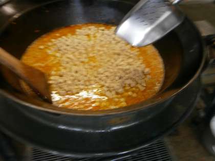 肉がよく炒まれば,せん切りにしたにんじんを加え,だし汁・さとう・みりん・しょうゆを加えて煮含めます。