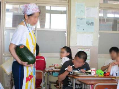 栄養教諭が学級を回って,冬瓜を見せに来てくれました。
