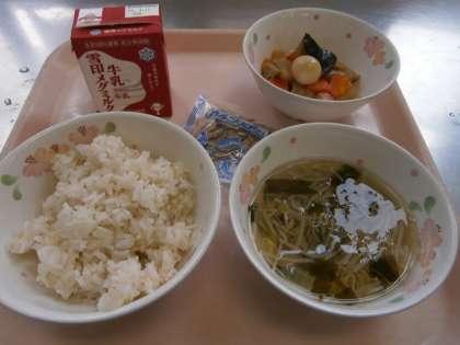 「わかめスープとじゃことプリプリちゅうかいためと ぎゅうにゅうが おいしかったです。」・・・1の3