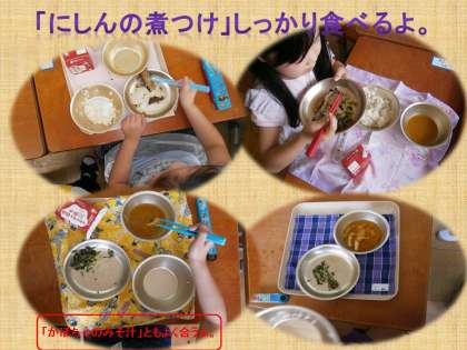 魚の中でも「にしん」は,小骨が多く苦手な子どもも多いのですが,1年生の子どもたちは,写真のように小骨まできれいに食べてくれました。給食室の大きな回転釜で時間をかけて煮た『にしん』は,骨まで軟らかく炊けます。