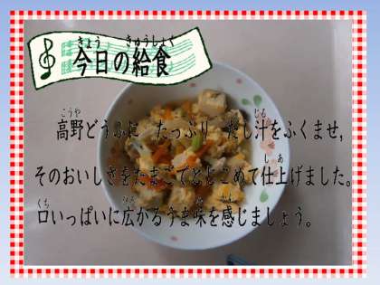今日は,給食カレンダーや電子紙芝居「給食室からこんにちは」で「高野豆腐」の良さを知って,しっかり食べようする子どもたちがたくさんいました。うれしいですね。