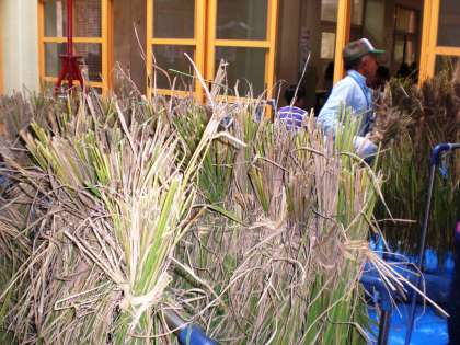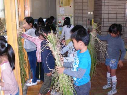 刈り取った稲を、ひかり庭(中庭)に,干しました。