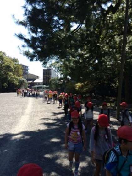 子どもたちは,京都御苑に無事に到着し,活動を続けています。もうすぐお弁当の時間で,おなかがすいてきたところです。マナー良く,見学しています。