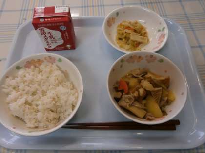 今日の給食は,「厚あげ」や「じゃがいも」などの野菜を「豚肉」といっしょに煮つけました。「厚あげ」は,だし汁としょうゆ・三温糖で先に煮て味付けしておいて『豚肉と野菜の煮つけ』にしました。しっとりとしていて,ごはんも食べやすかったようです。