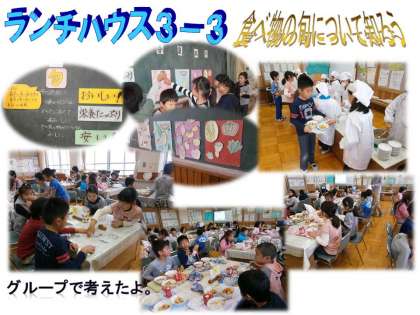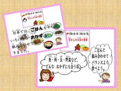 いっしょに給食を食べた3年生は,食材の「おいしい」「栄養たっぷり」「安い」時期『旬』についてみんなで考えました。給食だよりや給食カレンダーなどから得た知識を思い出しながら,食品カードの旬を春・夏・秋・冬に分けました。ヒントは給食の献立。いつごろ どんな給食のメニューで食べたかな?