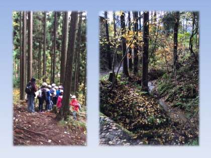 茅葺屋根の山家や美しい自然の中を散策しています。これから活動する野外炊事場も見学しています。
