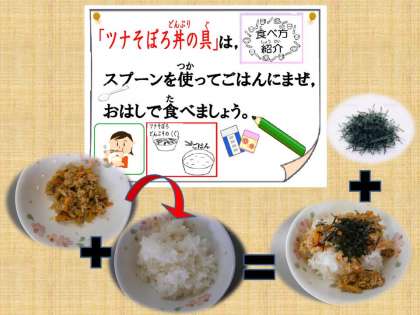 教室で,『ツナそぼろ丼(具)』を『ごはん』にのせて,『きざみのり』をふりかけ まぜながら食べます。自分で作ると何だかとても楽しくて食欲も増します。