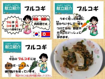今日の給食は,韓国・朝鮮の料理『プルコギ』でした。