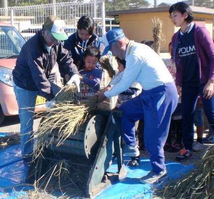 地域のみなさんにお越しいただき、脱穀機で稲穂から籾をとりました。