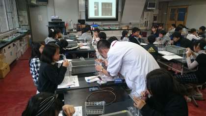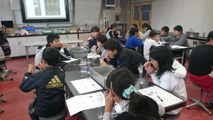 試験官に水を入れたものに息を吹き込んで音を出しています。