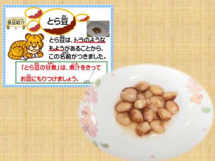 今日は,特に4月当初に比べて,子どもたちの食べる力がついていることを強く感じる事ができました。それは,家庭ではあまり食べなれていない『とら豆の甘煮』なども残さず食べられていることからも感じます。『とうふの吉野汁』では,「しょうが」のしぼり汁が入っていて少し大人の味のようにも感じますが,「だしがきいて あったかくておいしい。」と言っている1年生がいるほどです。
