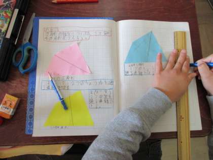 四角形を直線1本を入れて三角形2つ,四角形2つ,三角形と四角形に分ける活動をしました。いろいろな分け方があることに気付きましたが,三角形2つにするには,向かい合った頂点を通る直線できること,四角形2つに分けるには,向かい合った辺を通る直線できること,三角形と四角形に分けるときは,頂点と辺を通る直線できることでまとめることができました。