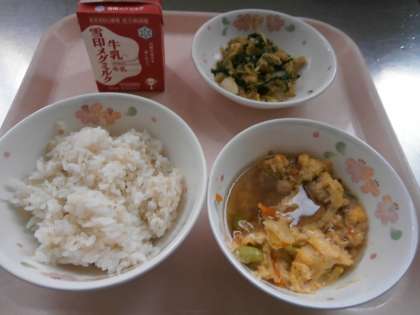 副菜には,「春菊」と「白菜」を使って『春菊と白菜のごま煮』にしました。独特の風味がある「春菊」ですが,昨年経験している子どもたちは,「おいしい。」と言ってくれていました。ごまの風味が食べやすかったです。