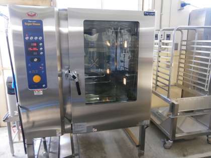 スチームコンベクションオーブン(スチコン)とは,コンベクションオーブン(ファンにより熱風を強制対流させるオーブン)に蒸気発生装置を取り付け,熱風または蒸気をそれぞれ単独で利用して「焼く」「蒸す」の調理ができます。また,熱風と蒸気を同時に利用することで,「煮る」「炊く」「炒める」などの調理が出来る多機能な加熱機器です。