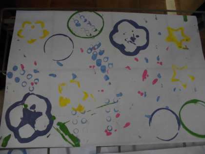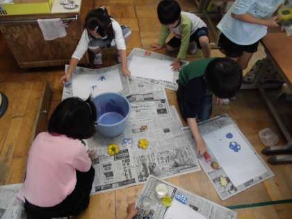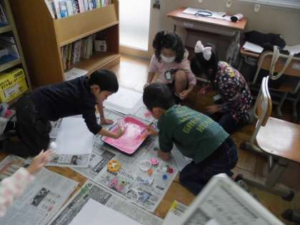 今日,図画工作科の学習「うつした かたちから」を行いました。野菜,ブロック,片ぬきなどを使って,半紙に好きな色を選んでスタンピングをしました。子どもたちは,出来上がる形に驚き、楽しく学習ができました。