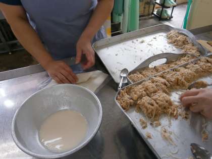 春巻きの皮に一人分に区分けされた 春巻きの具を巻き行きました。