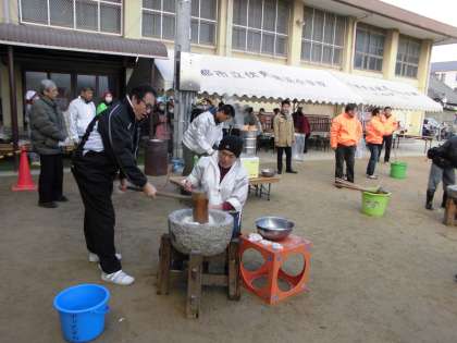 今日は朝早くから地域のみなさんがたくさんお越しになって、お正月の集いを行いました。子どもたちが楽しみにしているお餅をたくさんつきました。