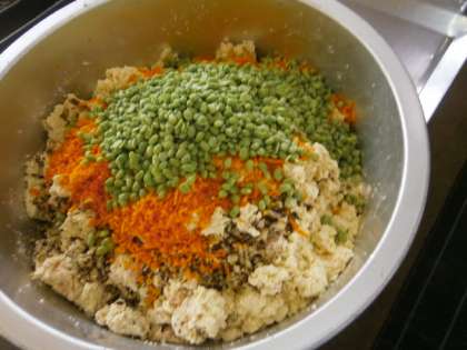 鶏ミンチ・おから・とうふ・にんじん・しいたけ・えだまめに小麦粉と塩・こしょう・しょうゆを加えてよく練り,一つずつ丸めて油で揚げて作りました。
