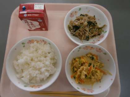 「もやしとこまつなのごまいためがおいしかったです。あげたまにがごはんとあっていておいしかったです。でもみつばが少し苦かったです。」・・・5の2