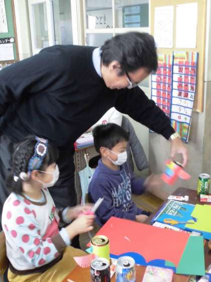 カラフルでかわいい作品ができています。作品ができたら、班で缶積みをしていました。