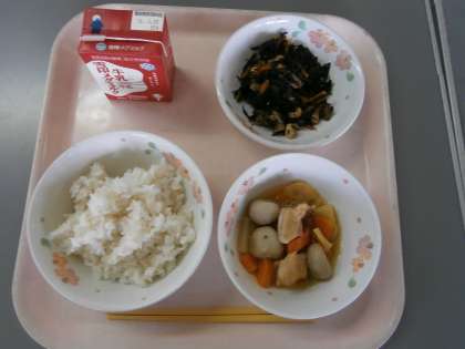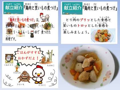 給食カレンダーでも電子紙芝居「給食室からこんにちは」でも,『鶏肉と里いもの煮つけ』について紹介しました。「鶏肉」と「里芋」「こんにゃく」「にんじん」「たけのこ」の合性が良く,ごはんが進む献立でした。食感を楽しみながら残さずいただきました。