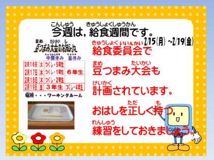 豆つまみ大会やハッピーキャロット,給食室からのメッセージなどたくさんの取組が予定されています。子どもたちにとって,給食についての たくさんの気づきがあるとうれしいです。