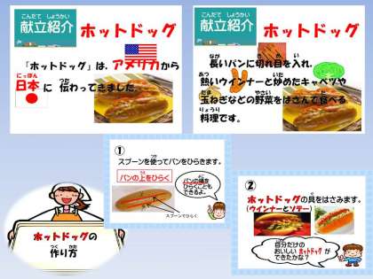 「ホットドッグの具のキャベツとウインナーとパンがとてもあっていておいしかったです。作るのも楽しかったです。スープのもやしがシャキシャキしていておいしかったです。」・・・5の2