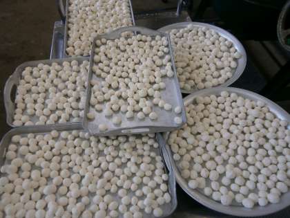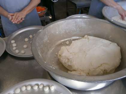 とうふと白玉粉をこねて一つずつ手作りのだんごです。