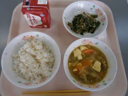 今日の給食は,豆腐料理を和風のカレー味にした『和風カレーどうふ』でした。