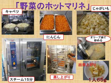 『野菜のホットマリネ』は,スチコンを使ってじゃがいもとにんじんを蒸して仕上げました。その結果,減塩することができました。減塩にもかかわらずしゃがいもも味がしっかりしていたという感想がありました。