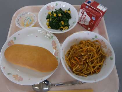 今日の給食は,毎年恒例で 1年生にとっても食べやすい献立『スパゲティのミートソース煮』・『ほうれん草のソテー』でした。