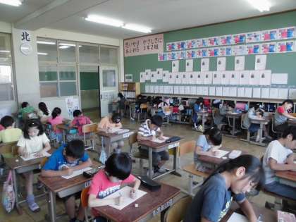 国語科「こまを楽しむ」の,単元が終盤に近づいています。説明文の構成を学び,感想を交流しました。単元の最後には自分の作ってみたい「こま」を考え,本文を参考に説明しました。子供らしい素敵な駒がたくさんできました。さらに,動きを文章で表現する練習としてみんなで腕相撲に取り組みました。