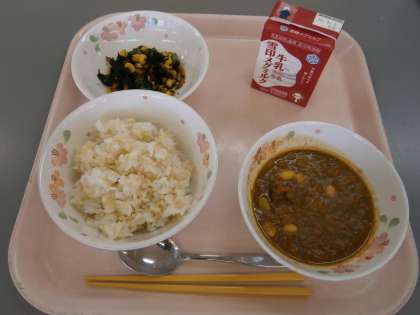 「キーマカレーのなかのまめがよんしゅるいありました。キーマカレーをげんまいごはんにかけたらあじがよかったです。キーマカレーがおいしかったです。」・・・つくし3ねん・5ねん