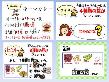 電子紙芝居「給食室からこんにちは」では,どんな豆が入っていたかクイズにしてみました。3択にしてみましたが,「白あん」に使われる「手亡豆」は,最近の子どもたちにはなじみがないようでした。でも,クイズはとても 盛り上がっていました。