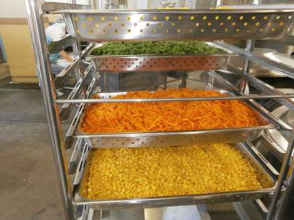 今日の『ひじきのソテー』の「にんじん・三度豆・コーン」は,スチームコンベクションオーブンで蒸しました。それぞれの食材の良さがよく出て甘く,調味料も減量しています。減塩効果に一役かっています。