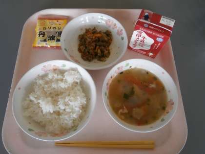 今日の給食は,さばの缶詰を使った『さばそぼろ丼』と2年ぶりの登場『トマトだご汁』でした。