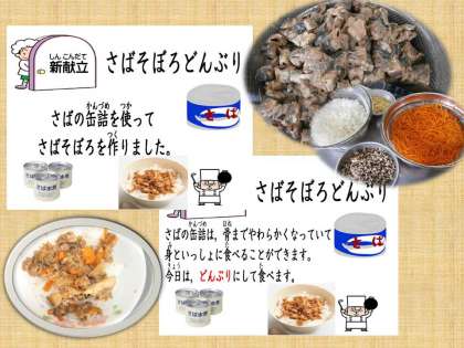 海から遠い京都では,昔から生の魚が手に入りにくかったことなどから,塩漬けの魚や干した魚を上手に利用してきました。今日は,昔の人の知恵が詰まった,「さばの缶詰」を使って『さばそぼろ丼の具』をごはんにのせて,丼にして食べました。味つけは少し甘めでしたが,ごはんにのせて食べる献立は,子どもたちにも食べやすく人気です。