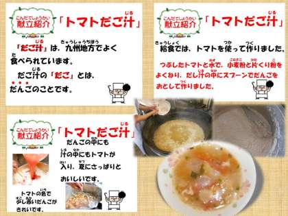汁物の『トマトだご汁』は,けずりぶしでとっただし汁に,トマトの果肉の入っただんごをすいとんのように入れて作ります。薄いピンク色のだんごがとてもめずらしく かわいらしくて人気でした。九州地方の「だんご」を「だご」と呼ぶ呼び方も 学習しました。ちょっぴり苦手なトマトも こんな食べ方ならおいしいね。