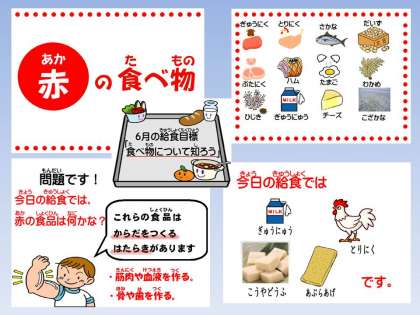 今日は,給食カレンダーや電子紙芝居「給食室からこんにちは」でも,赤の食品について紹介したので,他の食品の働きにも興味も持ち「『みかん』てみどりやな」と言っている子どもがいました。緑のはたらきについては,6月23日に詳しく紹介します。