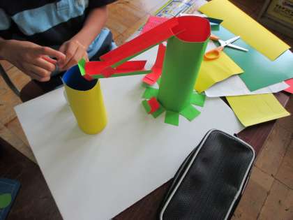 ビー玉がコロコロと転がるように高低差をつけ,子どもたちは工夫して作品を作っています。ビー玉を転がしながら試行錯誤しています。