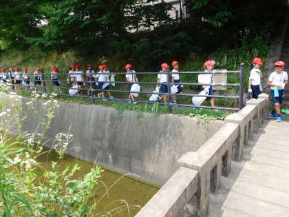 今日は、4年生が十石舟に乗せていただき、三栖閘門記念資料館での見学学習を行い、その後、宇治川派流の清掃活動を行いました。
