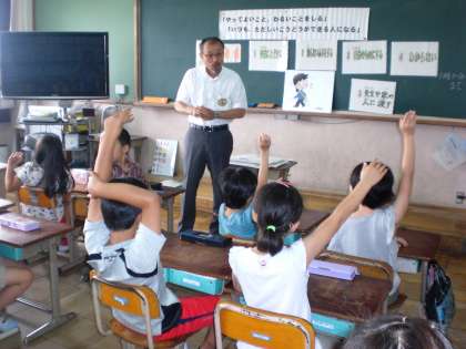 3年生の子どもたちにわかりやすく、社会の約束やモラルから、市民生活を守るためにルールがあって、そのルールを破ってしまうことが犯罪につながるとの学習をわかりやすく話してもらいました。