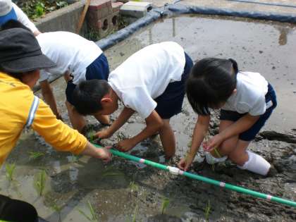 2年生の生活科で、田んぼで米づくりをしています。