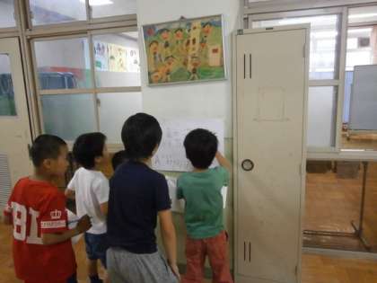 子ども達は問題を探しながら,歯のクイズに挑戦しています。「あそこにクイズが貼ってあったよ。」など,友だちと協力しながら問題の答えを考えています。