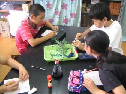 ほうせんかの苗の土を落としたものをフラスコに入れ,色水(切り花着色剤)を吸い上げさせて,次の日に根・くき・葉の様子を調べました。