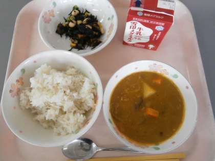 「ポークカレーが,ぶた肉がたくさん入っていてとてもおいしかったです。ポークカレーは,まろやかで食べやすくご飯もすすみました。ひじきのソテーはひじきといろいろなおまめの味がしてとてもおいしくたべられました。ご飯もいつもとかわらないおいしさでした。これからも体に気をつけてきゅうしょくを作って下さい。おいしいきゅうしょく ごくろうさまでした。」・・・6の1
