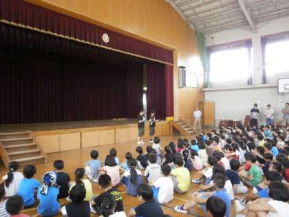 今日の児童朝会で委員長と副委員長が全校のみんなに呼び掛けました。