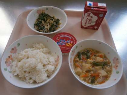 「今日の高野どうふのそぼろにが,高野どうふに味がしみていて,とてもおいしかったです。ほうれん草ともやしのごま煮もほど良くやわらかくて,食べやすくてとてもおいしかったです。」」・・・6の1