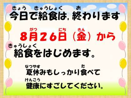 明日から楽しい夏休みです。元気に思い出深い夏休みになるよう願っています。楽し夏休みを元気に過ごすためにも,しっかり食べて規則正しい生活を心がけてください。