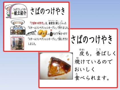 『さばのつけ焼き』は,昨年の2月に一度実施しているので2年生以上の子どもたちは,今回2回目になります。スチームコンベクションオーブンの先行導入で6月の『さわらの幽庵焼き』・7月の『さけの塩こうじ焼き』といった焼き魚を提供できるようになりました。